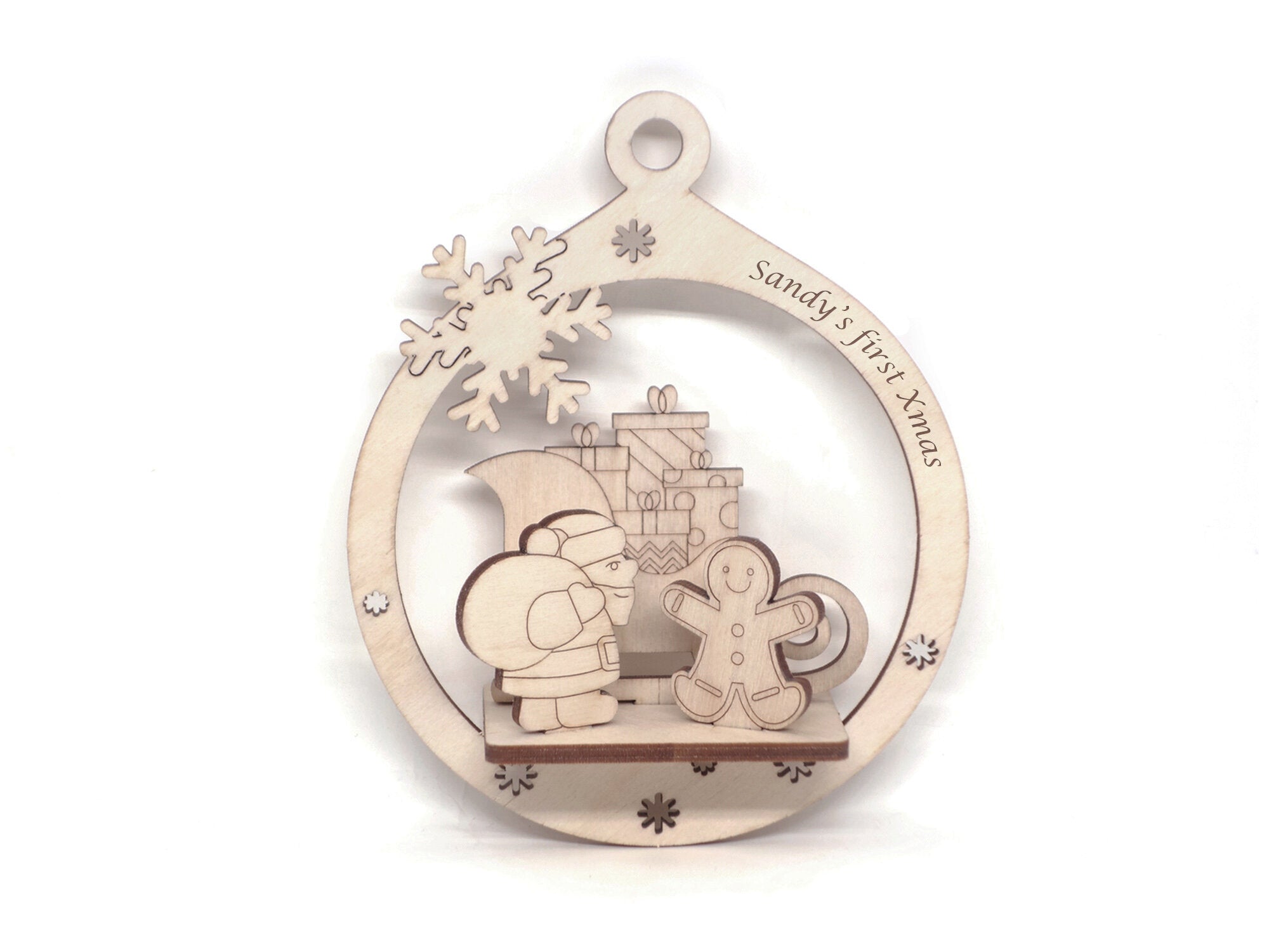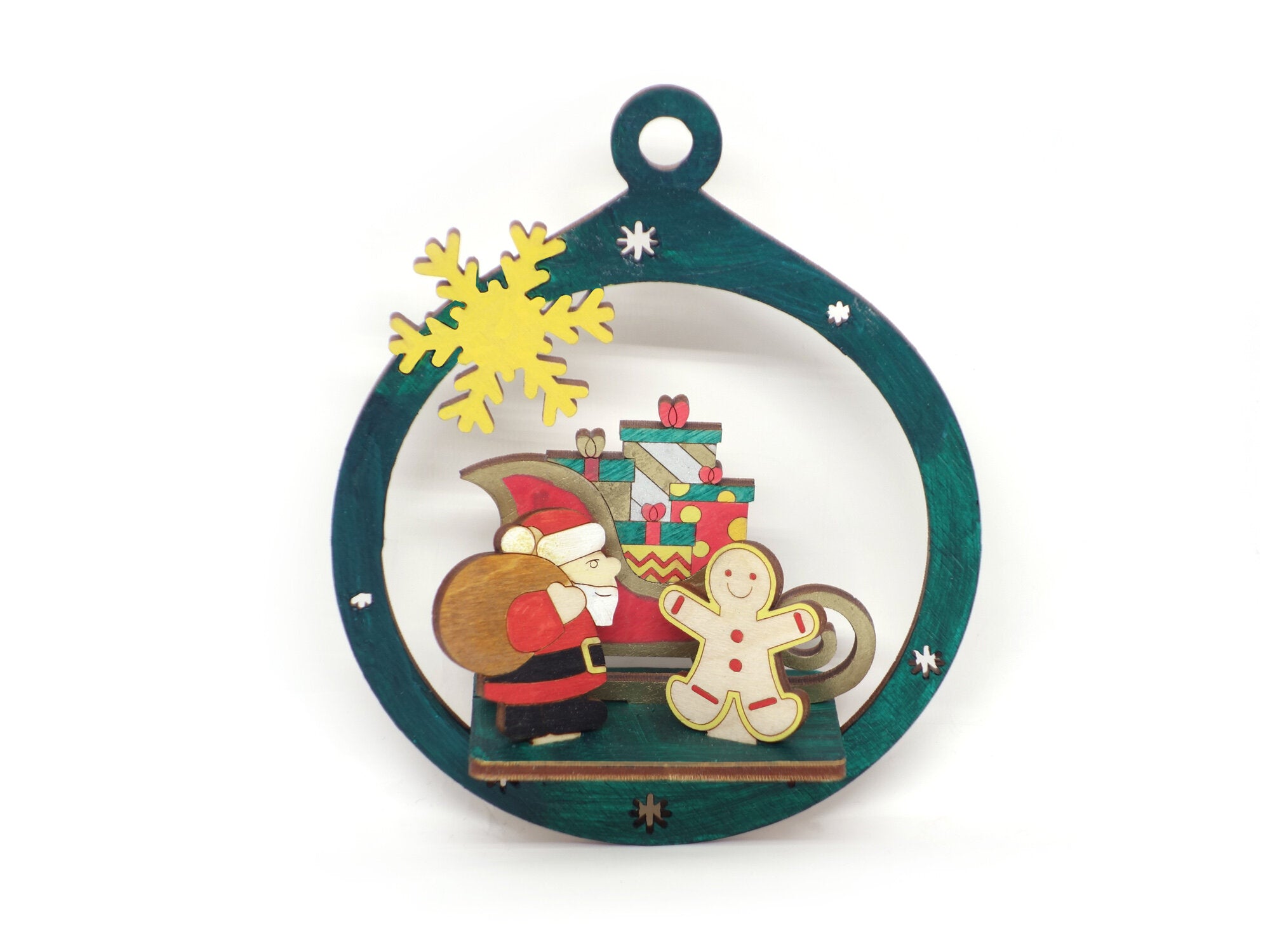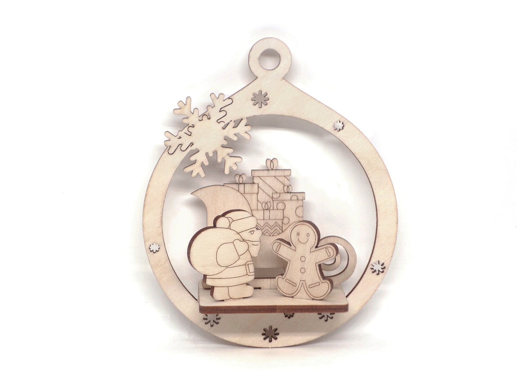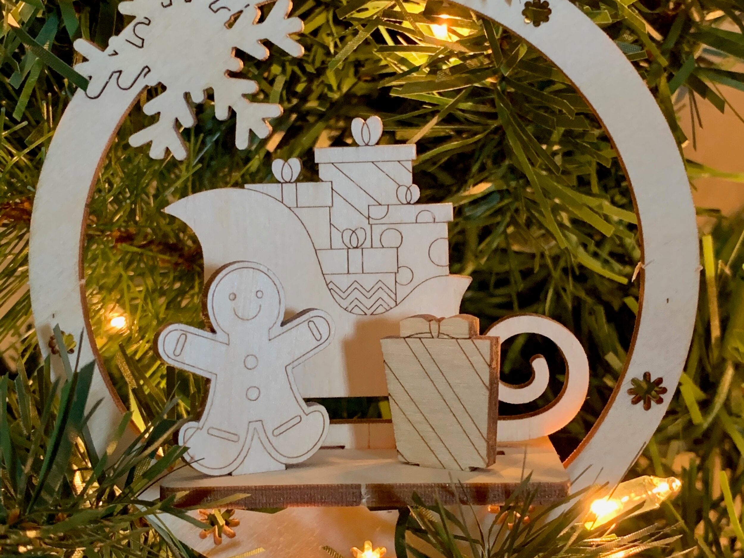 This wooden laser cut sanded Santa and Sleigh ornament has a platform on which you can arrange the sleigh, Santa and gingerbread man as you wish. Designed and made with exceptional attention to detail out of Baltic birch wood, this three-dimensional ornament makes a lovely gift topper, gift exchange item or stocking stuffer. Make it your own! All the elements (the hoop, platform, Santa, sleigh and gingerbread man) can be personalized with paints or markers.