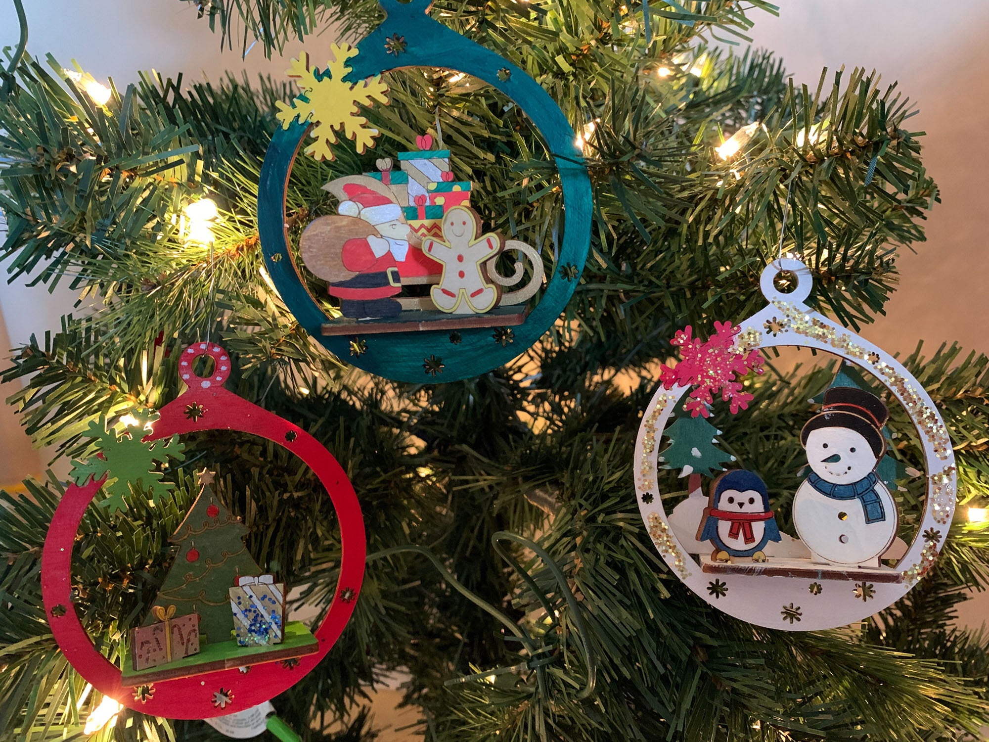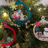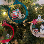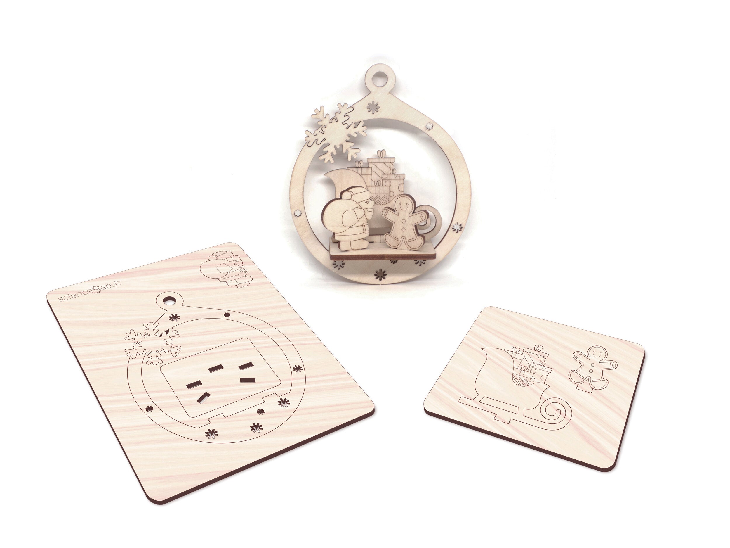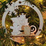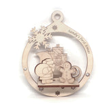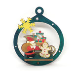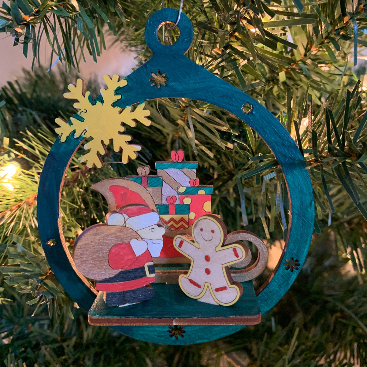 This wooden laser cut sanded Santa and Sleigh ornament has a platform on which you can arrange the sleigh, Santa and gingerbread man as you wish. Designed and made with exceptional attention to detail out of Baltic birch wood, this three-dimensional ornament makes a lovely gift topper, gift exchange item or stocking stuffer. Make it your own! All the elements (the hoop, platform, Santa, sleigh and gingerbread man) can be personalized with paints or markers.