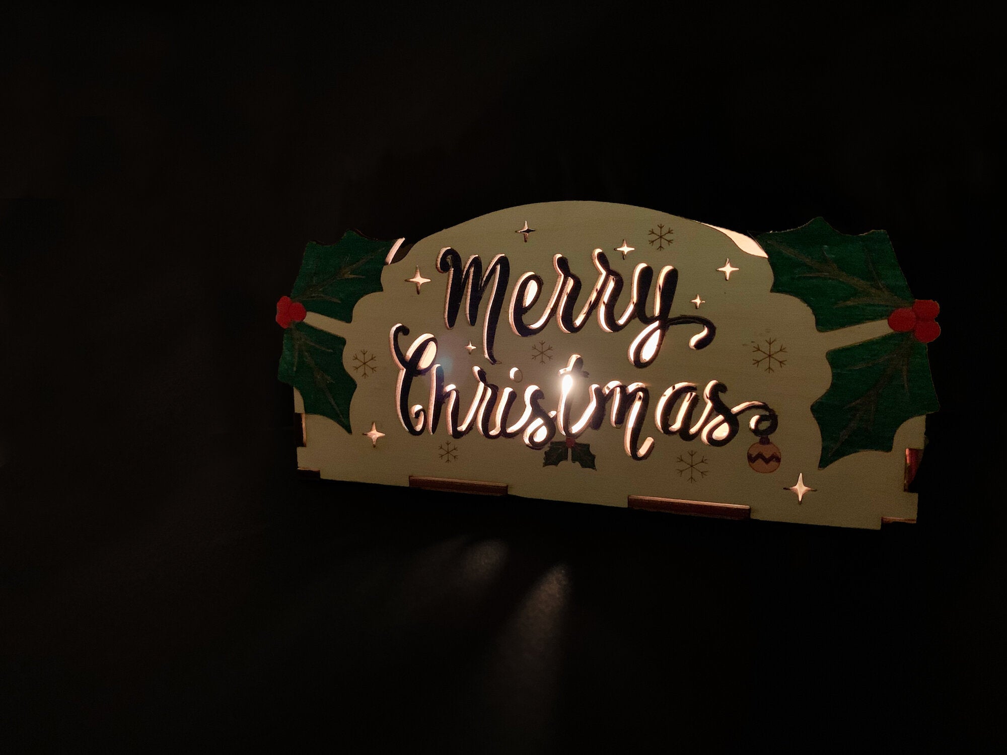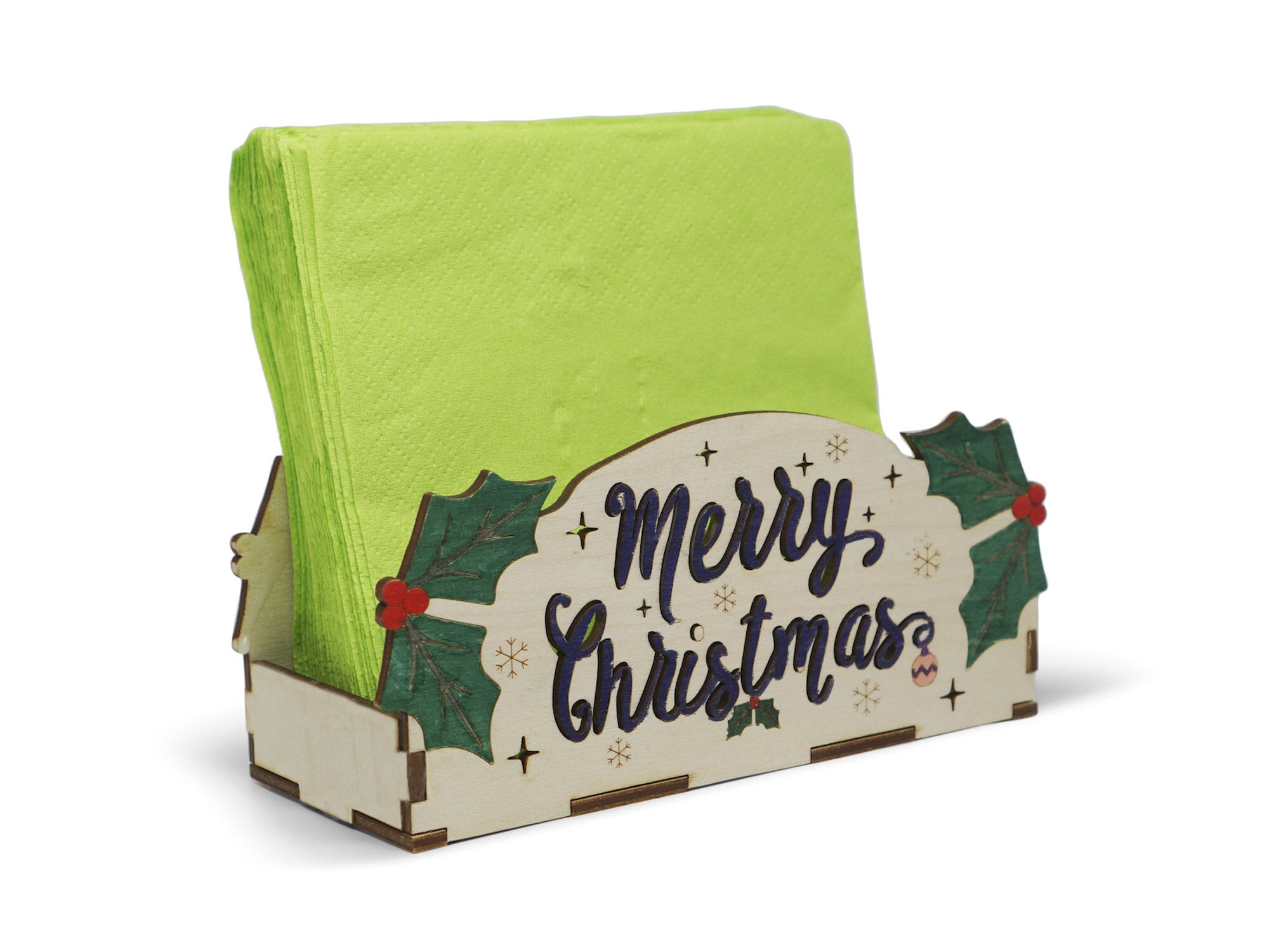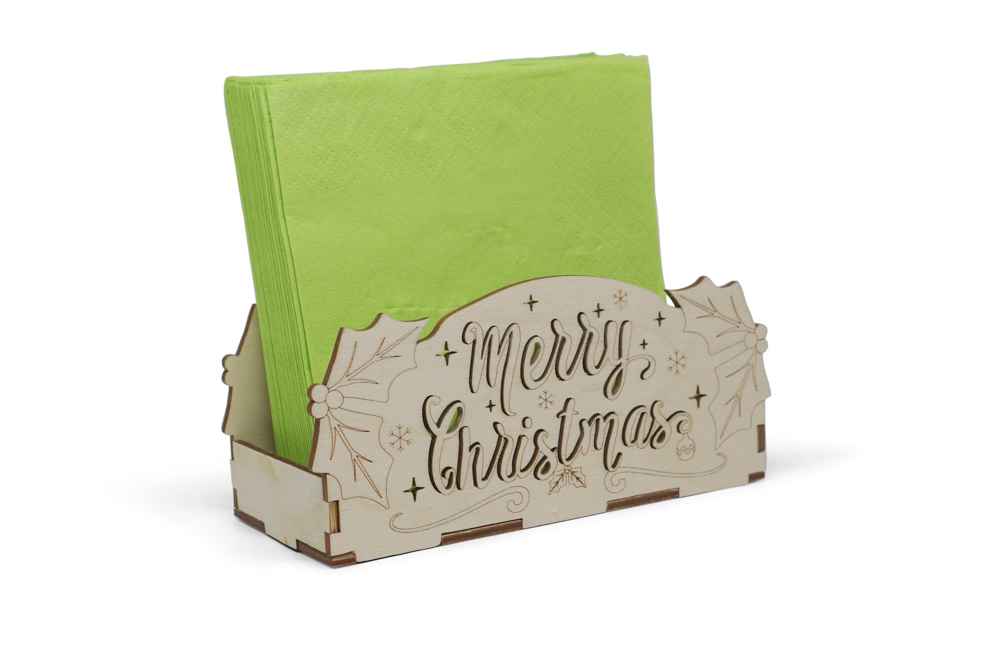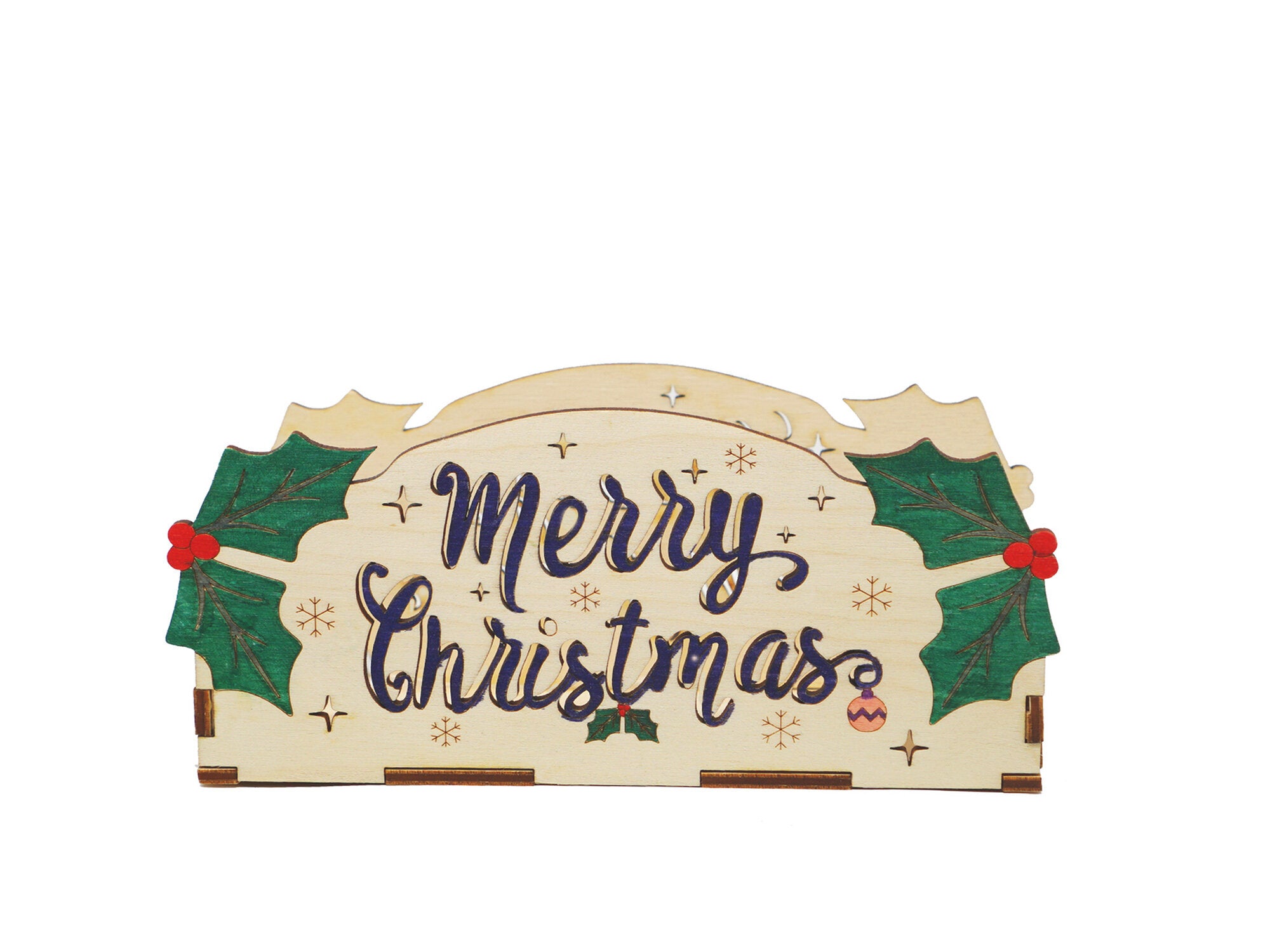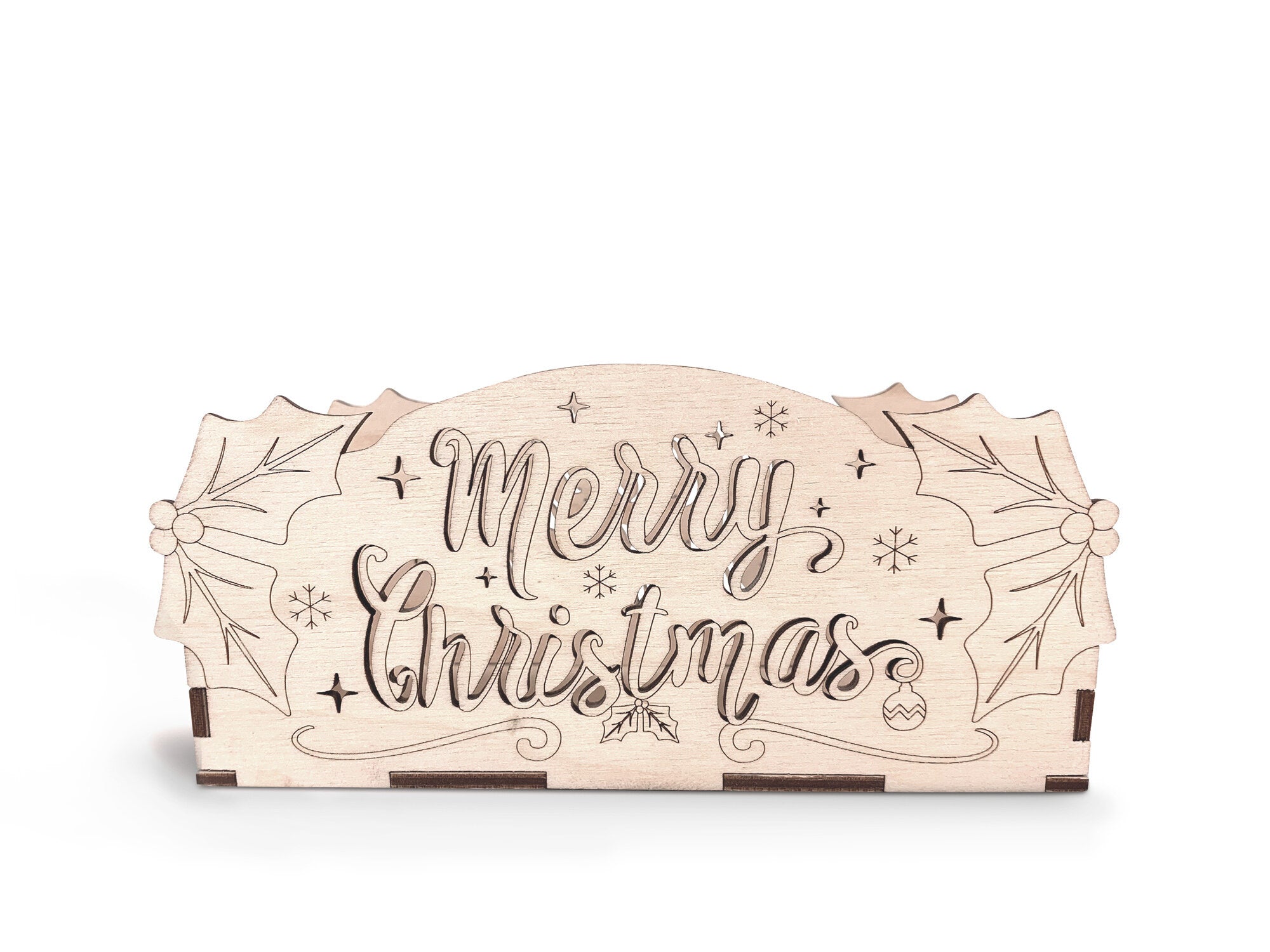 This fun Merry Christmas themed Holiday DIY kit comes with laser-cut wooden pieces that can be colored with markers or paint. Use tea lights or LED lights (recommended) to create fun shadows and reflections and watch it shine in the dark. Use the box as a napkin holder or recipe card holder. Be careful when using tea lights as the box is made out of wood!