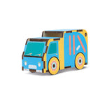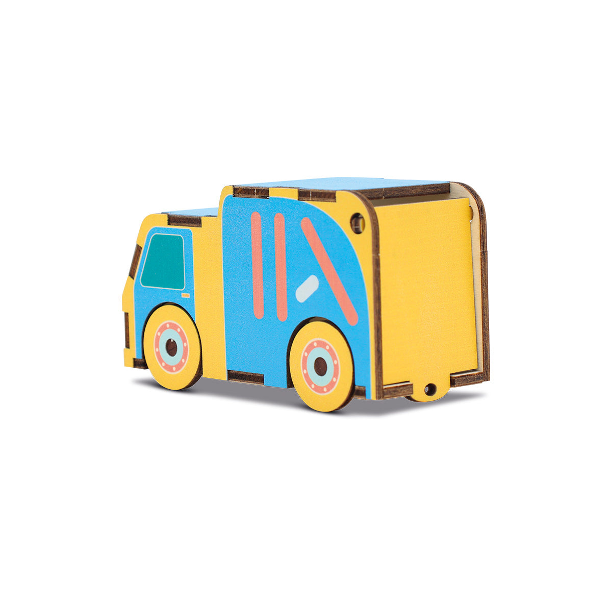 Our cheerful yellow blue colored  DIY garbage truck is here. Unleash your inner engineer with this  3D laser cut and colored wooden DIY Garbage Truck! Crafted from laser cut birch plywood, this DIY garbage truck is the perfect tool for transporting small toys and ensuring their safe delivery. Conduct STEM experiments by loading the truck with varying weights to test weight distribution and friction on different surfaces. Witness physics in action through your own designed experiments!