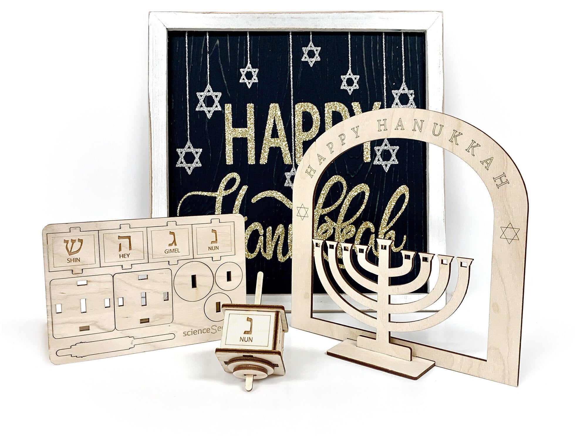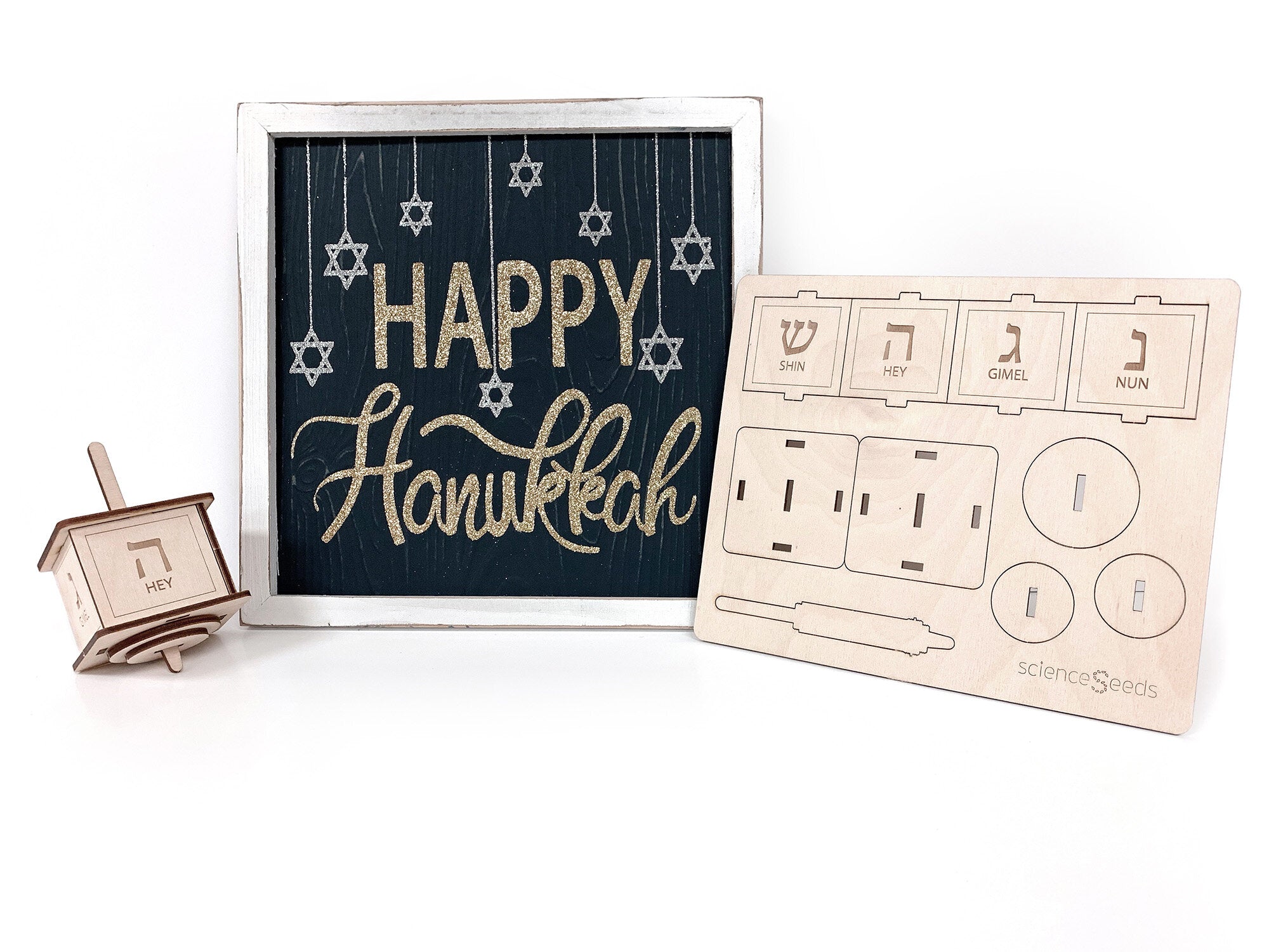 Creative Hanukkah fun for the whole family! Surprise your kids as they make and personalize their very own dreidel using this DIY laser-cut dreidel kit. Assemble your own Hanukkah dreidel with this DIY laser-cut Kit. Designed by our in-house team and tested by kids this wooden dreidel is manufactured in Princeton NJ. The dreidel arrives flat packed and includes all the parts and instructions necessary for easy assembly. All the components slot together using our carefully designed grooved tabs meaning that no glue is required to assemble. We make two versions of the dreidel based on the lettering you would like. This dreidel is a non Israel Dreidel. The letters Nun, Gimmel, Hey and Shin are engraved on each side.