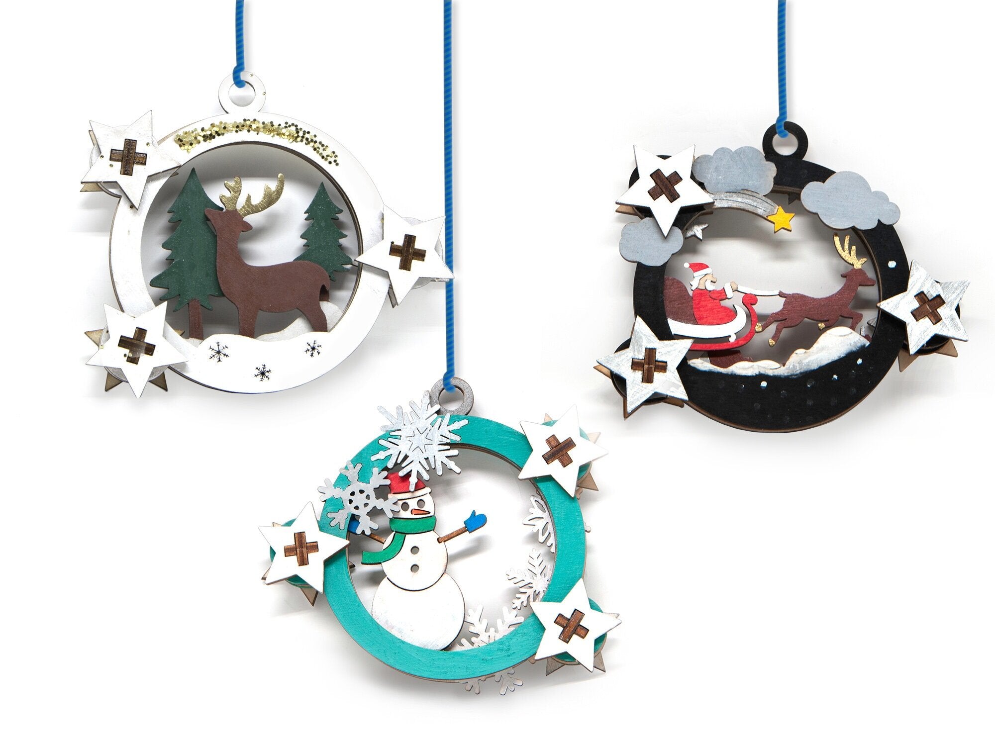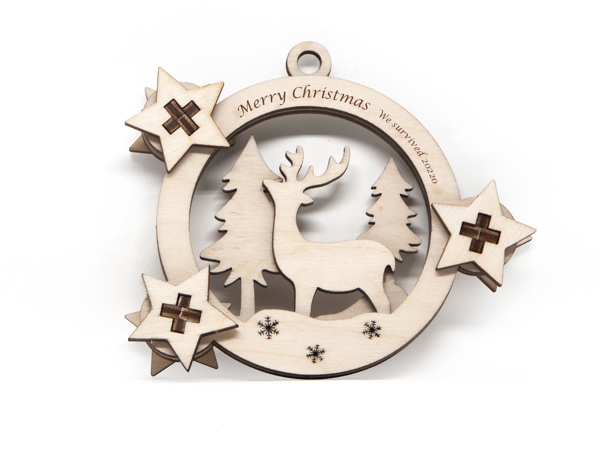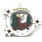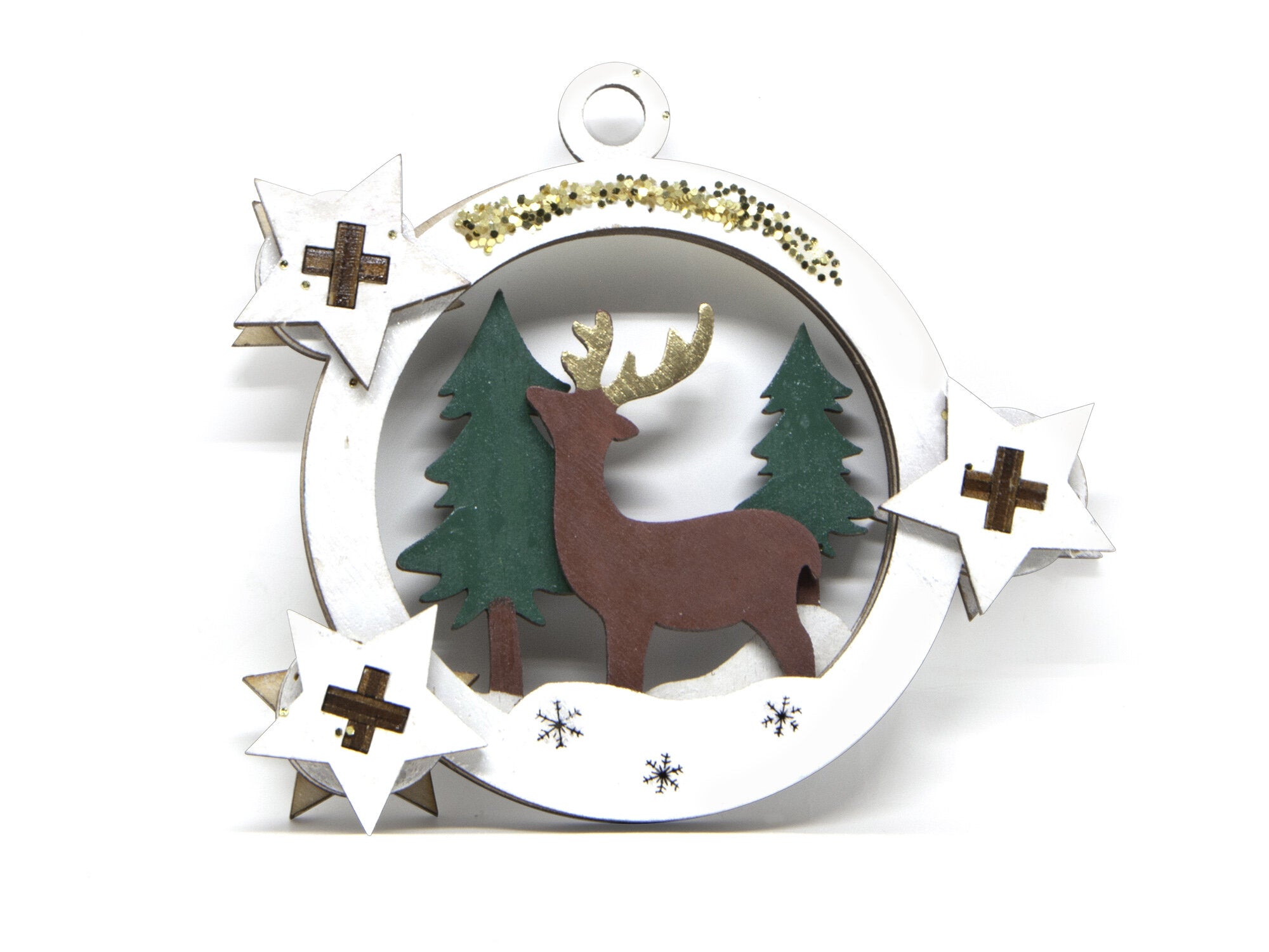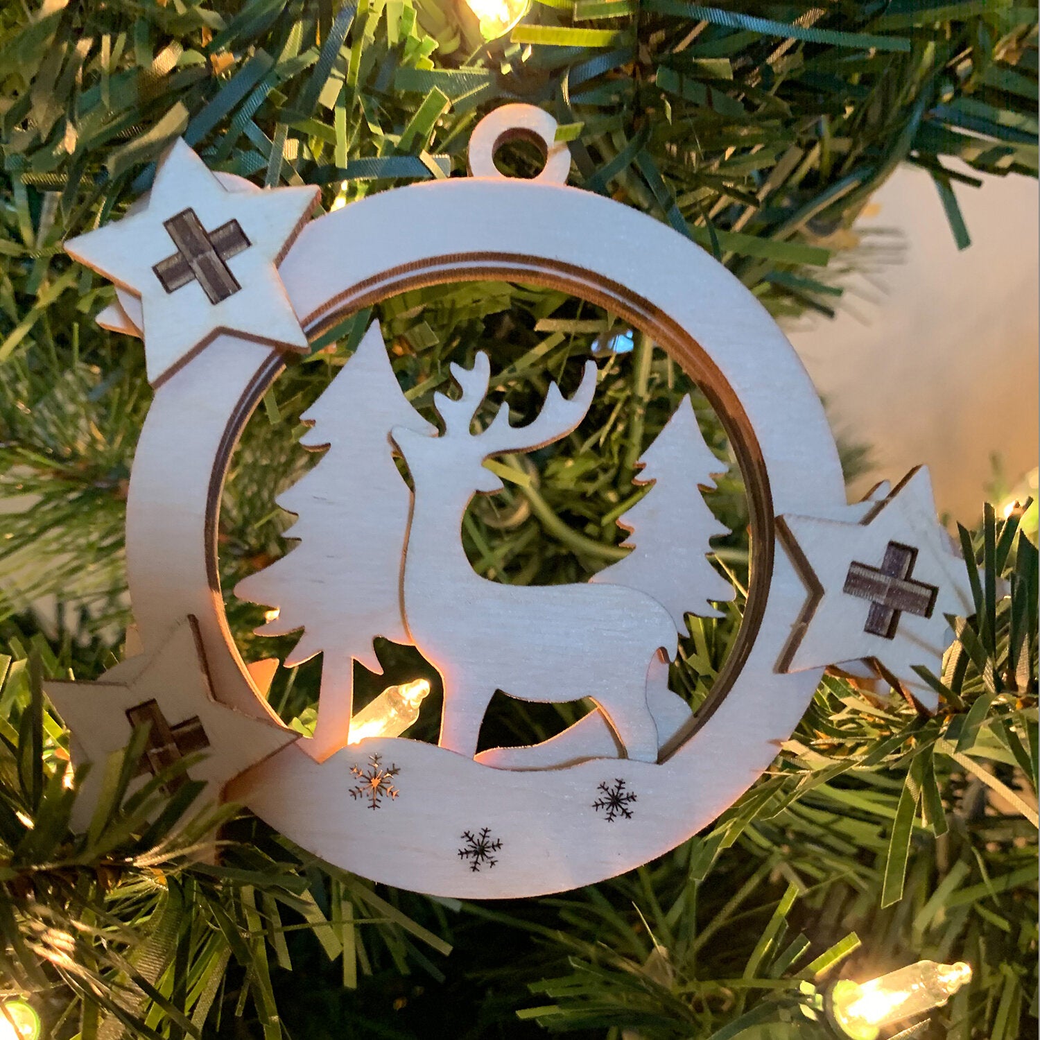 Layered pieces of sanded laser cut baltic birch wood make up this modern take on a classic ornament. This wooden laser cut Reindeer and Pine tree scene is the perfect Christmas tree ornament. Makes a great gift topper, gift-exchange or stocking stuffer. Designed and made with exceptional attention to detail, its a must have for anyone who loves Christmas.