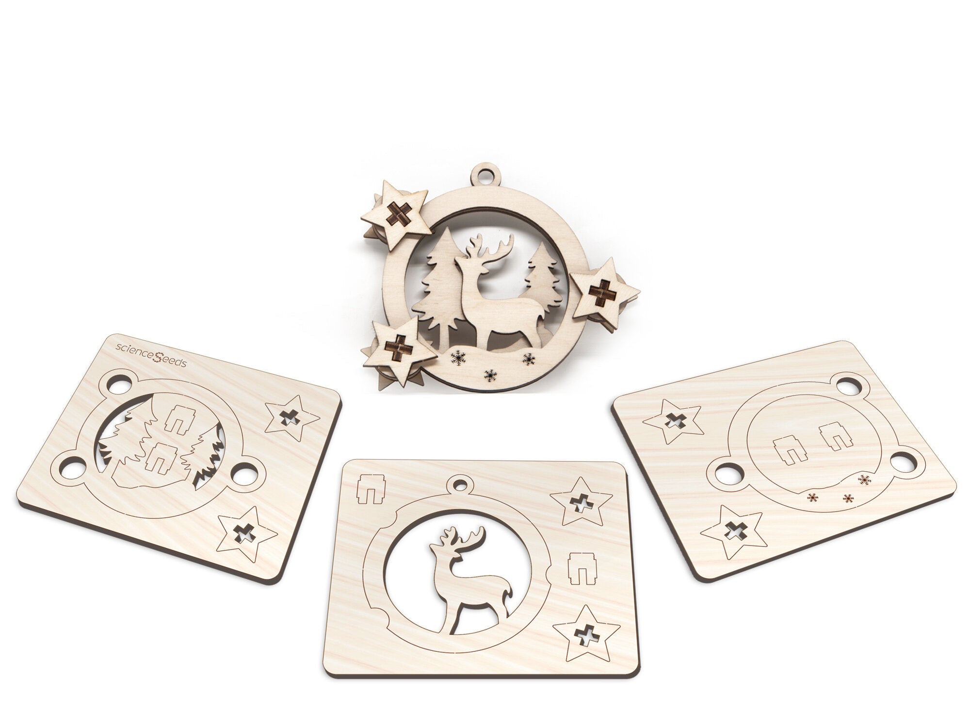 Make it your own! The ornament can be painted with paints or markers. Once painted, stack the layers and connect them using the enclosed pins and connectors. The ornament can be admired from both sides.