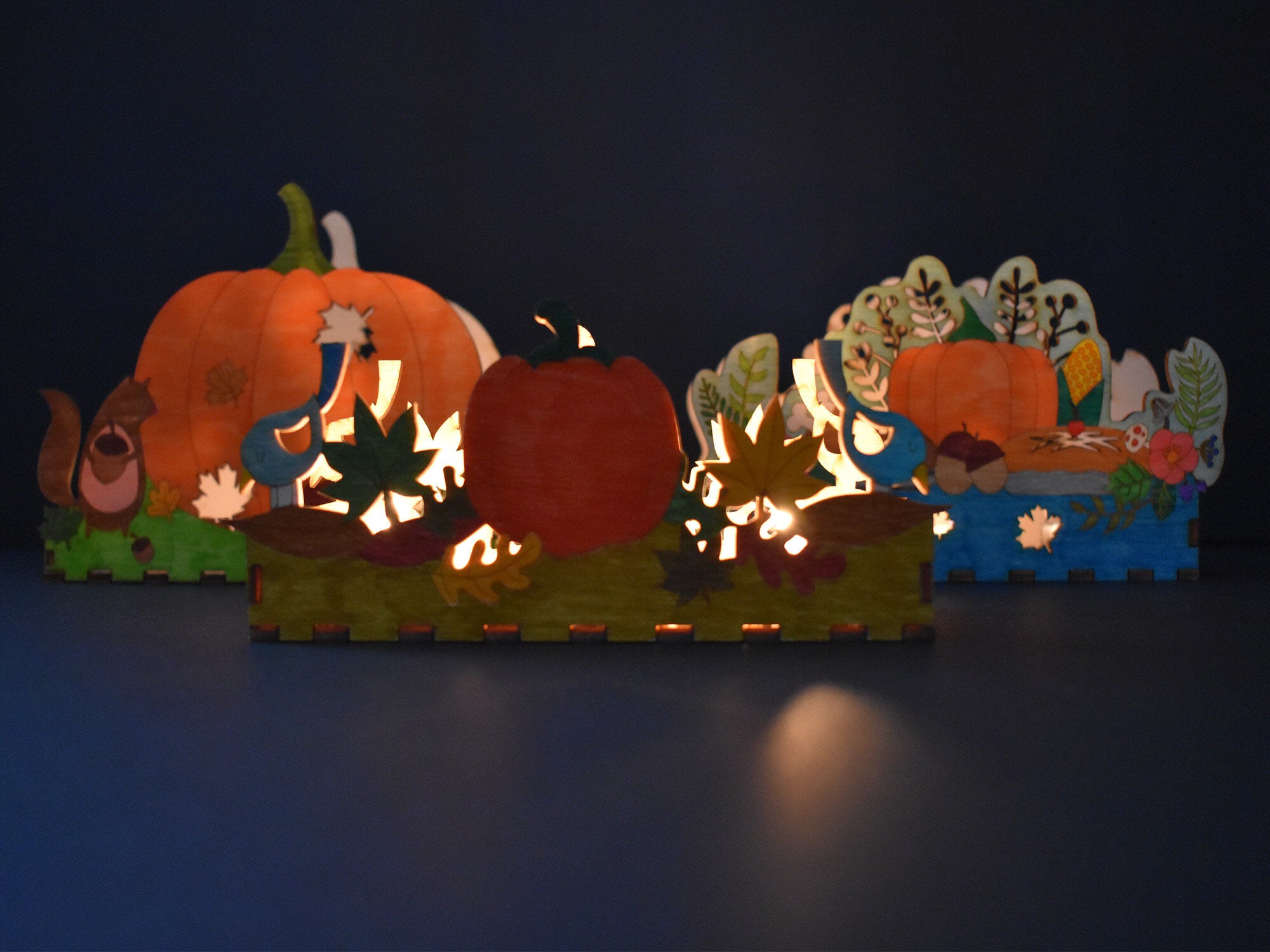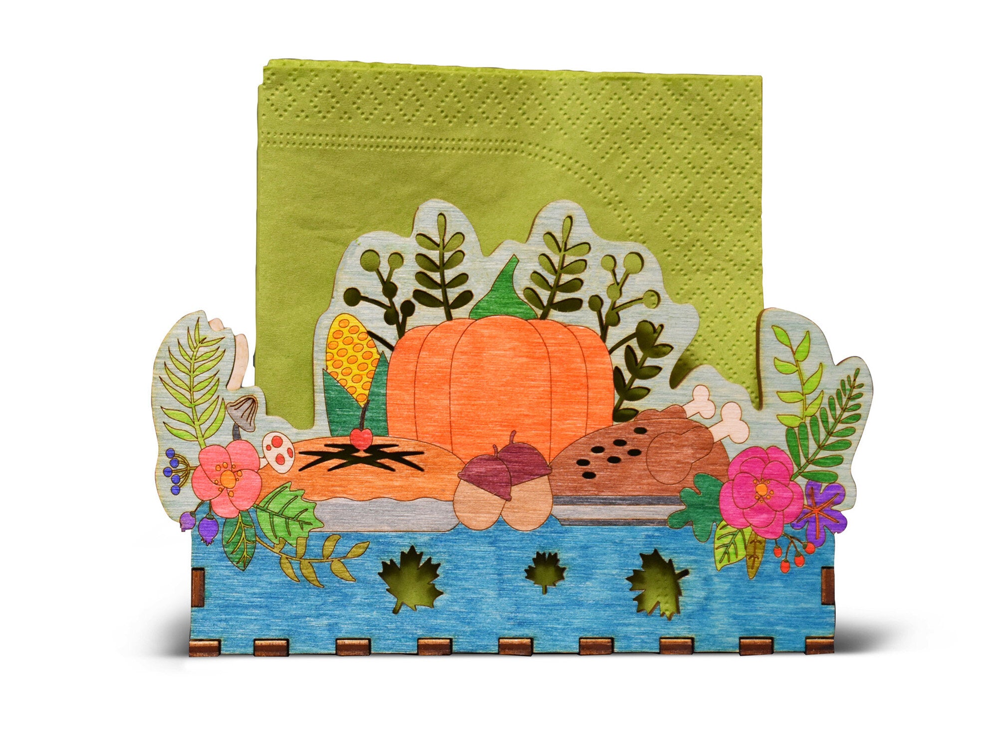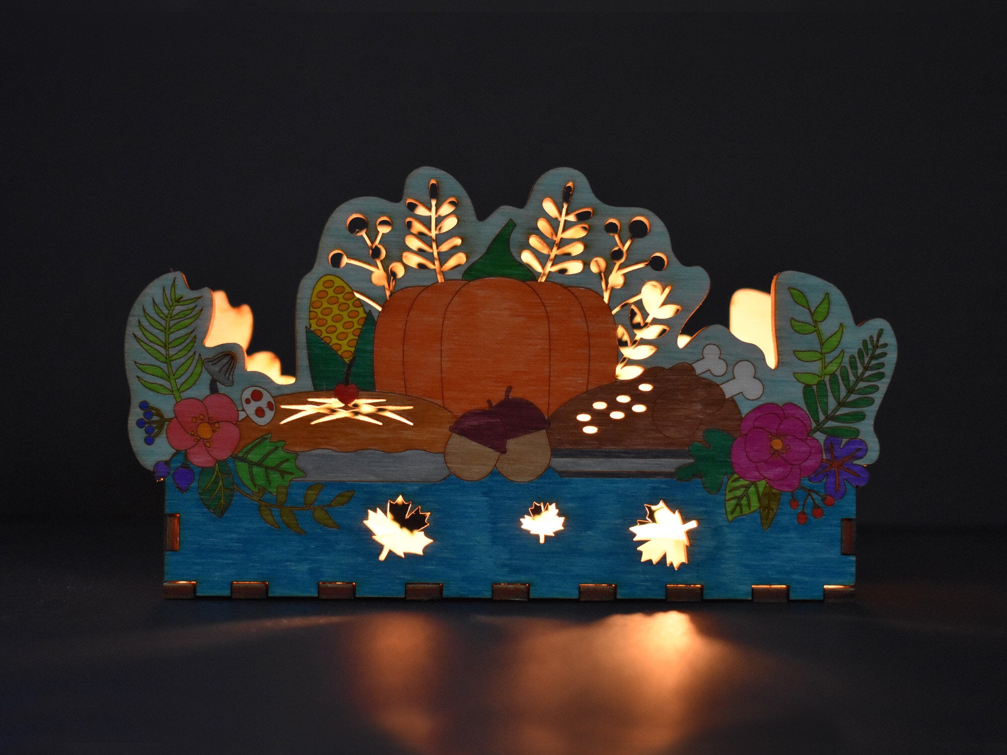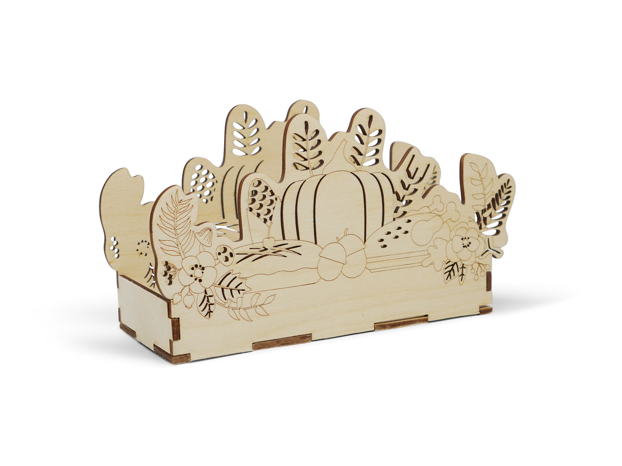This fun intricately engraved Bountiful Harvest includes many of the most common Thanksgiving meal components. The kit comes with laser-cut wooden pieces that can be colored with markers or paint. Get your creative juices flowing and discover what you can make. Use tea lights or LED lights (recommended) to create fun shadows and reflections and watch it shine in the dark. Use the box as a napkin holder or recipe card holder. Be careful when using tea lights as the box is made out of wood!